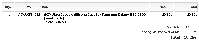 Tras varias visitas a ebay, dealextreme, etc nos hemos decidido comprar una funda de silicona para nuestro SII, nos hemos decantado por este modelo por precio y por venir en el pack con un protector SGP Steinheil Ultra Crystal Film para proteger la pantalla del que hablan muy bien en varias paginas, todo por 18.26 incluyendo el envío.