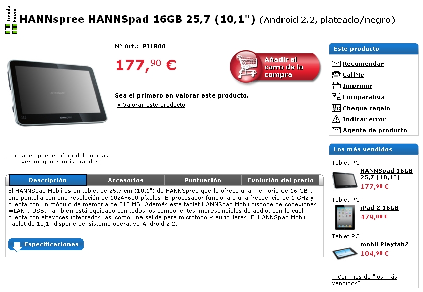 el Hannspad, no aparece que modelo es pero suponemos que sera el mas economico el sn10t1 y lo tenemos disponible en Alternate por 177.90€ mas portes.