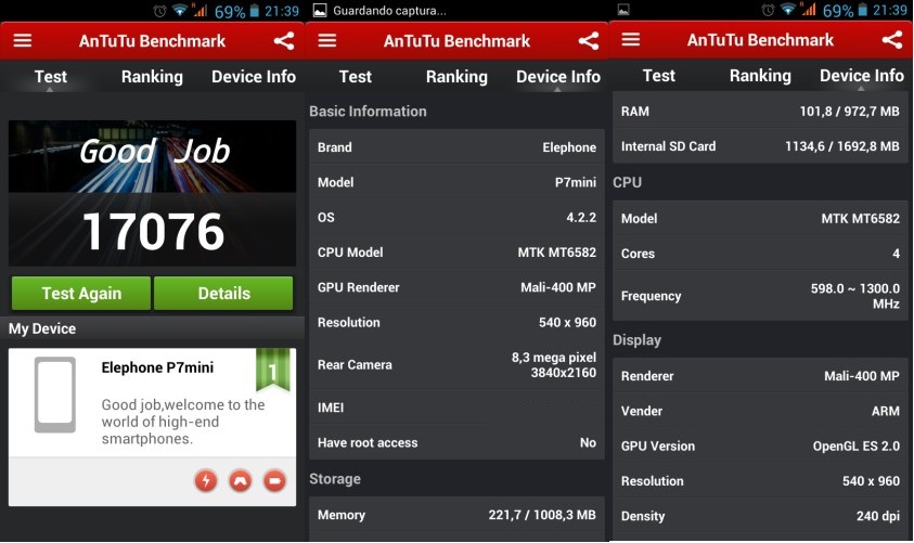 Si estas buscando un movil barato pero que te permita ejecutar ciertas aplicaciones este modelo puede ser una buena opcion, el SoC MT6582 nos proporciona potencia suficiente para la mayoria de aplicaciones asi como un consumo bastante ajustado, unido a su bateria de 2500 mAh puede llegar a los 2 dias con un uso moderado, precio bastante ajustado, viene a salir alrededor de los 95 euros, podeis ver la entrada con el resto de caracteristicas y el enlace a la tienda donde lo hemos pedido: Elephone P7 mini