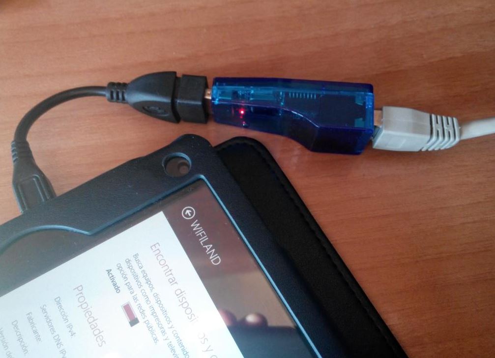 Y para los que necesiten conectarlo a la red mediante cable también podemos usar adaptadores usb to lan, como el siguiente comprado hace tiempo en focalprice, podéis encontrarlos por 4€ aproximadamente, enchufar con un adaptador micro usb otg y listo.