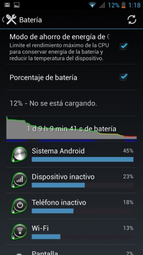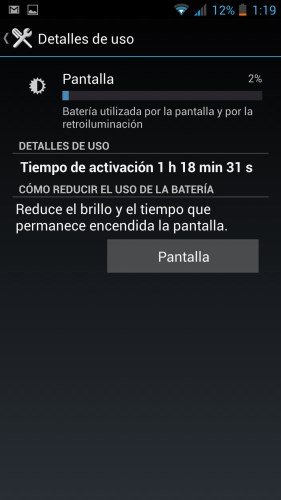 Con las pruebas realizadas no podemos determinar la duración real de la batería, ya que en un uso mas exhaustivo con mas llamadas y mas tiempo de pantalla seguramente veríamos reducida la duración comparada con las siguientes capturas, aunque con un uso medio debería poder llegar a alcanzar un día de uso.