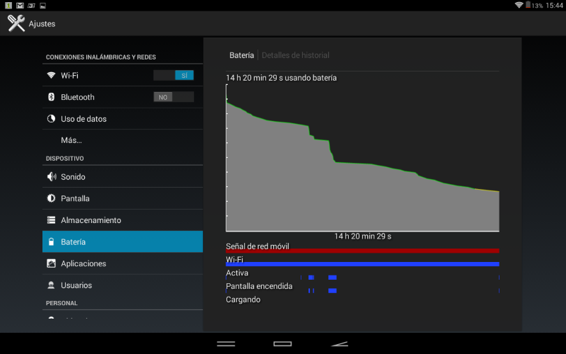 La batería se comporta dentro de lo normal, aunque en reposo con la wifi encendida puede consumir bastante y es conveniente apagarla cuando no la usemos.