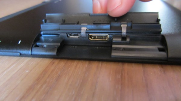 El conector microusb, miniHDMI y el conector para tarjetas microSD están ocultas, tendremos que levantar la solapa para poder conectar los cables o introducir la tarjeta microSD, (el puerto microusb también recibe carga, si la tenemos enchufada al equipo se ira cargando al mismo tiempo que lo usamos para copiar o descargar archivos).