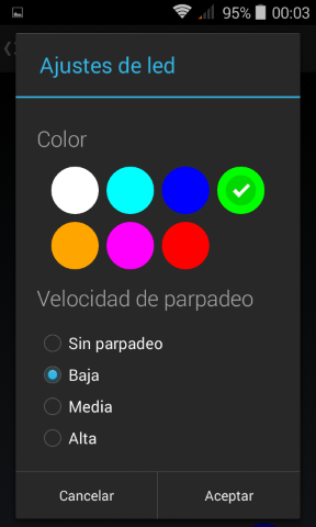 Dispone de led de notificaciones en la parte superior izquierda, podemos cambiar el color del led así como la frecuencia de parpadeo, también nos permite añadir mas aplicaciones con el color deseado.