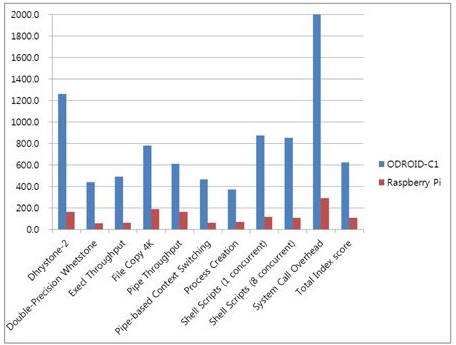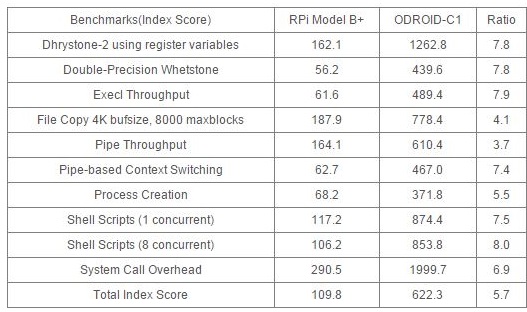 También podemos ver una comparativa en la propia web donde sale mejor parada la odroid-c1 aunque hay que destacar que han realizado las pruebas con un modulo eMMC con la que la velocidad de acceso es muchísimo mas rápida que con la microSD.