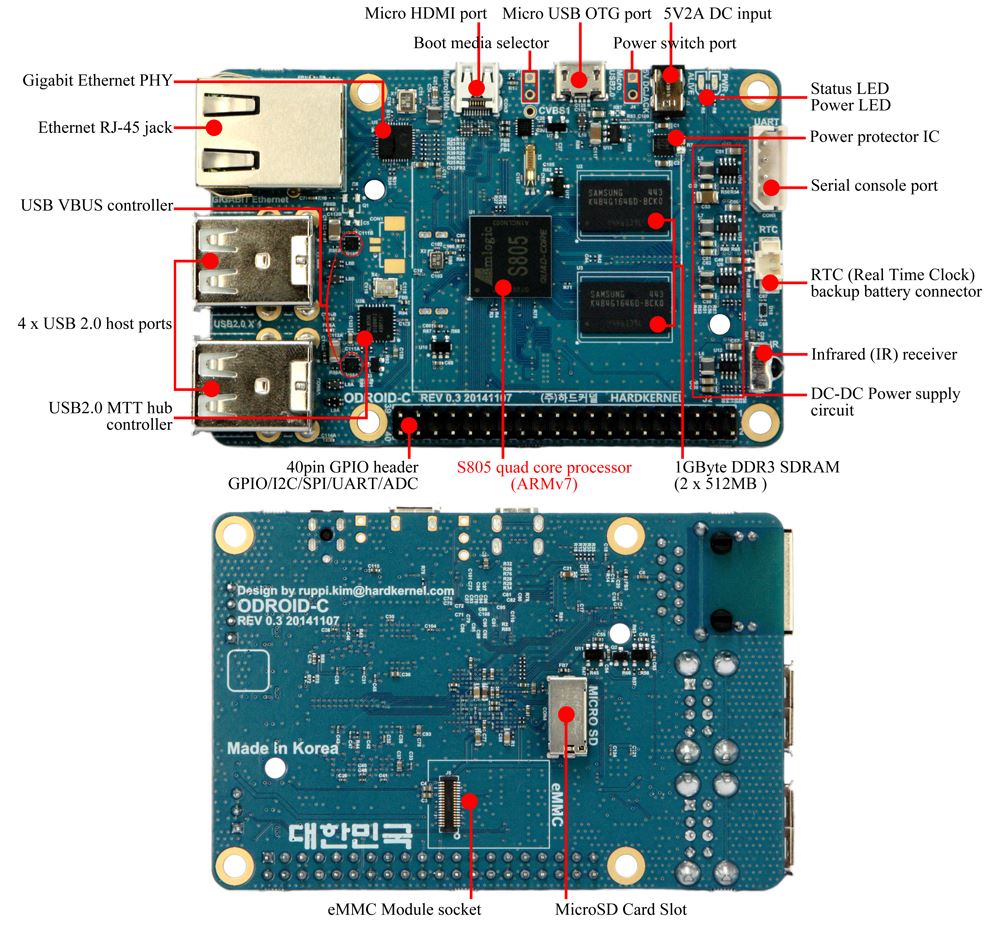 En la imagen anterior podemos destacar algunos detalles a favor de la Odroid, como el procesador Amlogic S805, el Giga de ram, el conector para memorias emmc, el puerto de red gigabit, entrada usb otg y el puerto infrarrojos integrado en la propia placa.