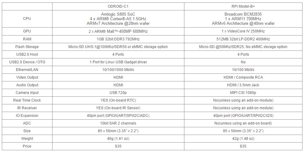 Podemos ver en la web oficial una tabla comparativa con la Raspberry donde vemos ciertos detalles que hacen mas atractiva el modelo de Odroid, aunque hay que tener en cuenta a favor de la raspberry el soporte a nivel de software mucho mas amplio.
