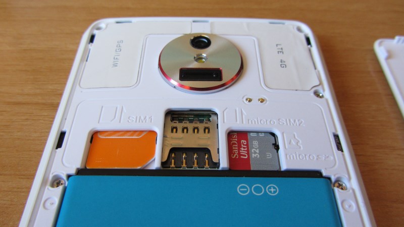 En la parte trasera vemos la cámara el flash led y el sensor de huellas en la parte superior, al quitar la tapa podemos ver las ranuras dual sim, una normal y otra microsim y la ranura para tarjetas microSD, en la parte inferior esta el altavoz.