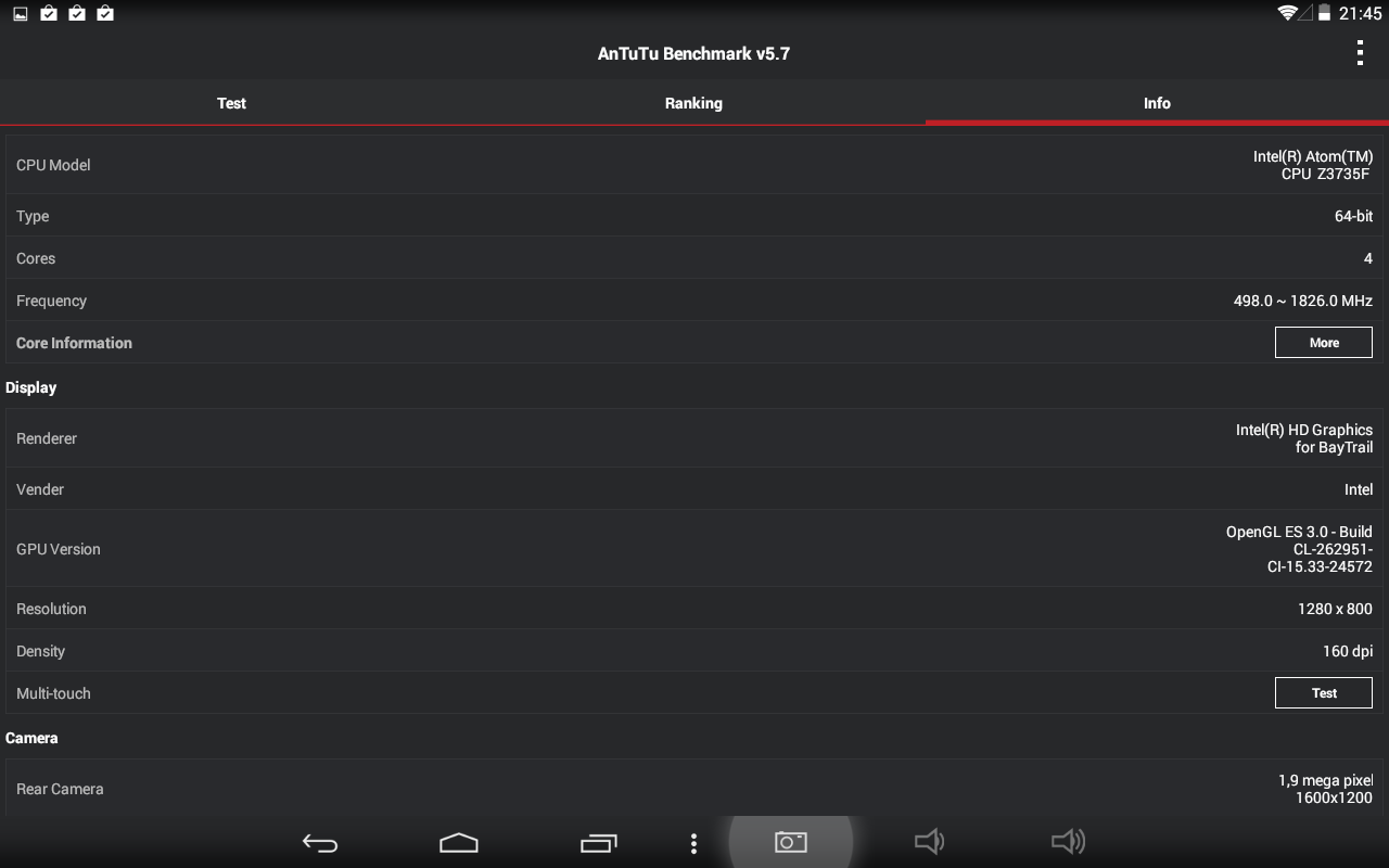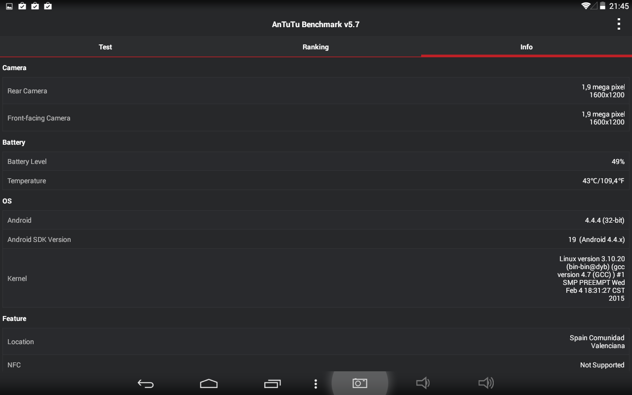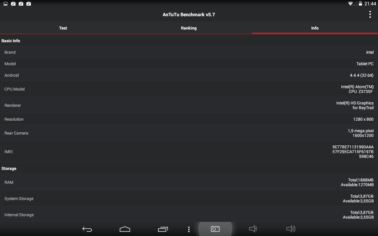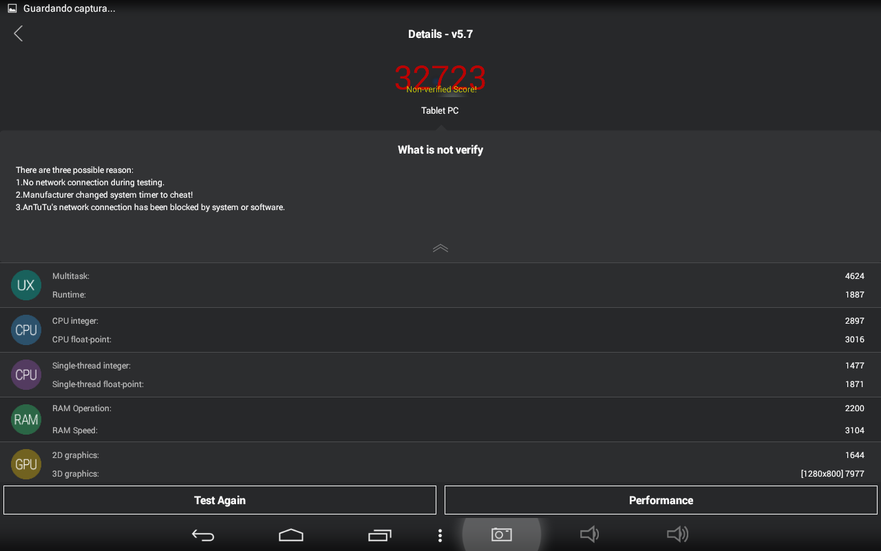 Aquí os dejo unas capturas de la Tablet con Antutu, nos da una puntuación de 32723 y podemos observar la capacidad de almacenamiento disponible para Android, de los 32 GB solo tenemos 3,.87 GB libres para instalar aplicaciones.