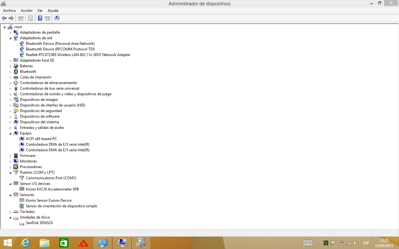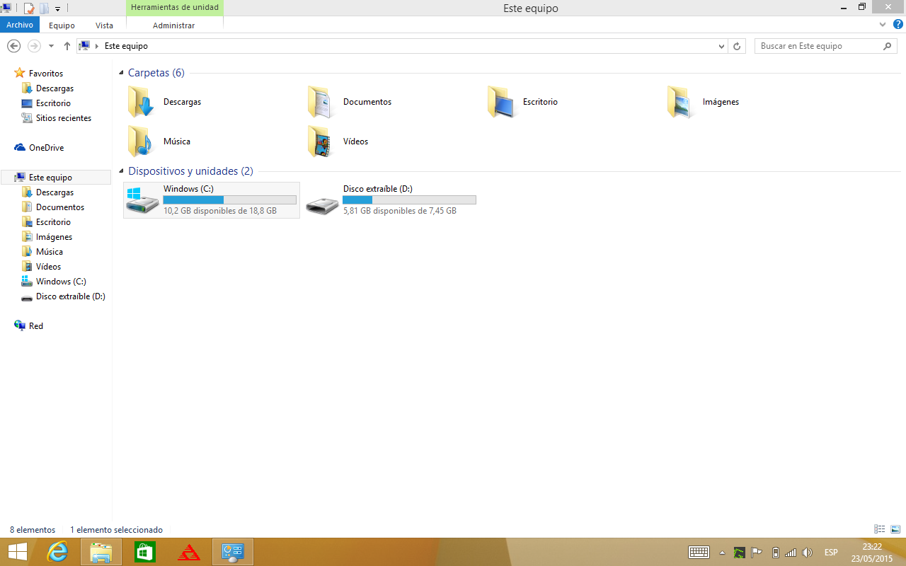 Para la sesión en Windows 8.1 el almacenamiento disponible pasa a ser de 18.8GB, en la siguiente captura podéis ver el espacio libre tras instalar alguna aplicación, la unidad D es un pendrive conectado al puerto OTG.