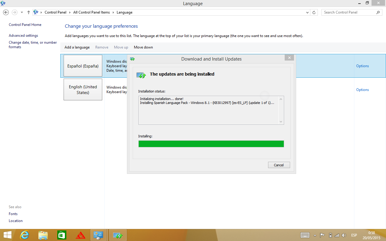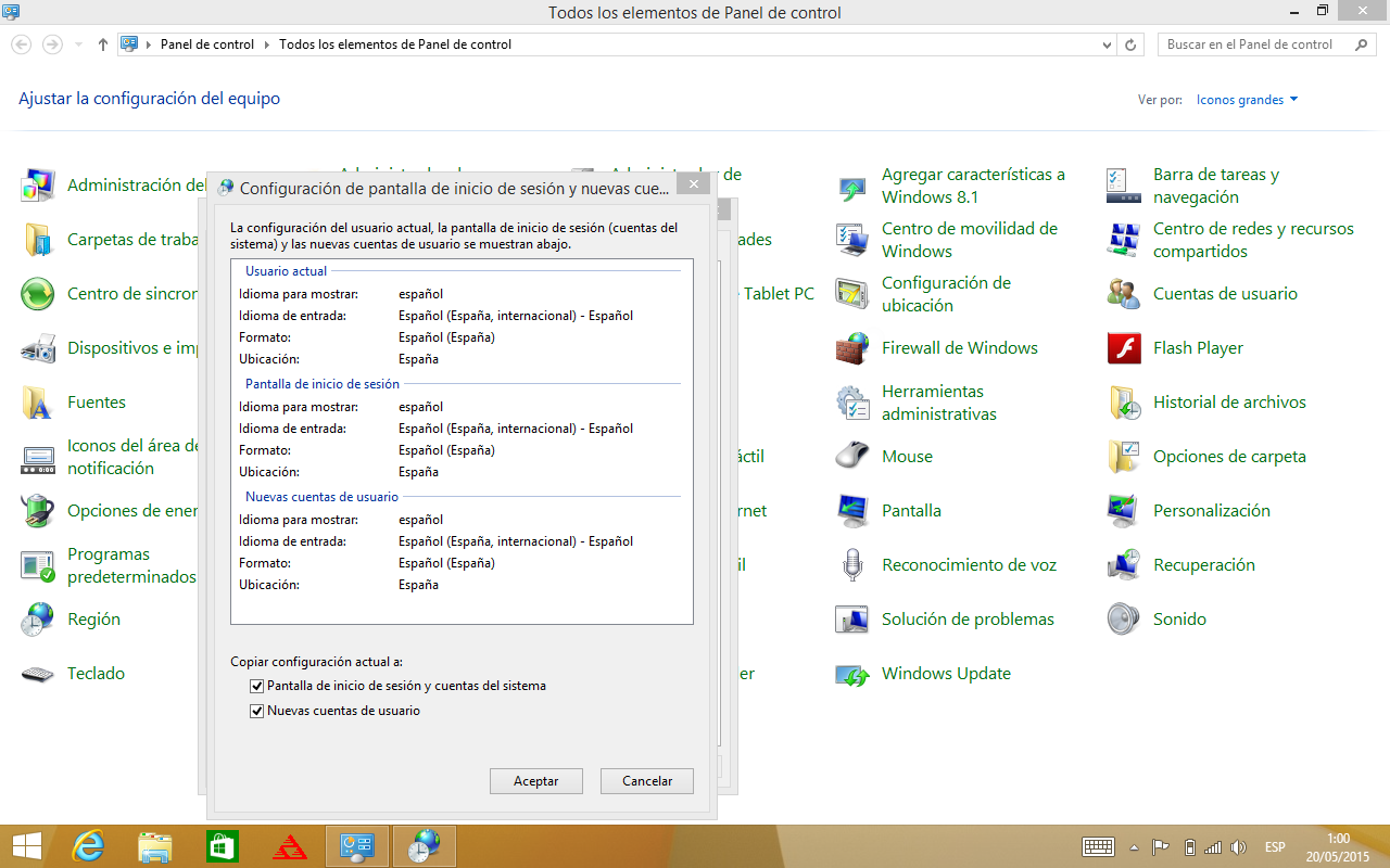 En esta pantalla podemos configurar todo en Español marcando las dos opciones de abajo, de forma que quedara en Español tanto para el usuario actual, pantalla de inicio y para nuevas cuentas de usuario.