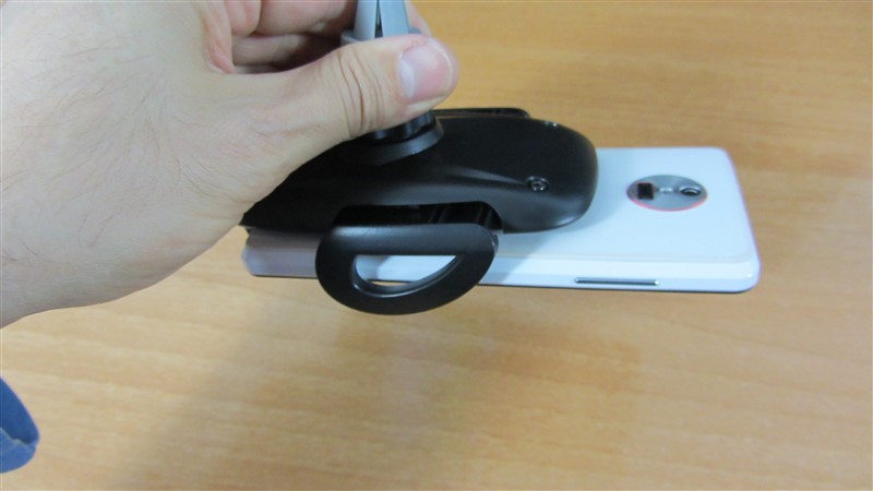 La pinza entra a presión en el soporte, tendremos que aflojar la rosca y presionar la rotula hasta que quede dentro, una vez situada solo nos queda apretar la rosca para fijar la posición, la rotula nos permitirá mover el soporte hasta encontrar la posición correcta.
