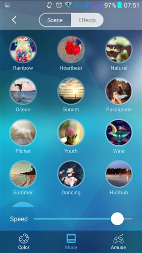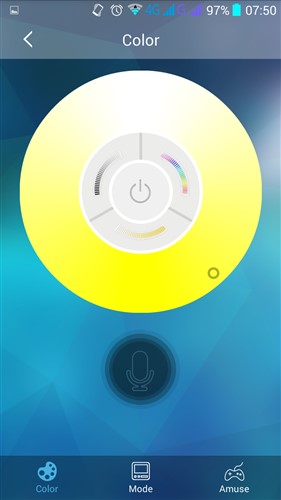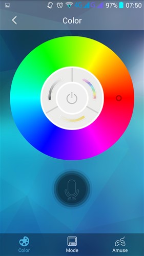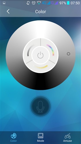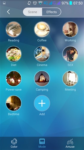 Además de un color fijo también podremos elegir una iluminación para distintas escenas predefinidas, así como seleccionar unos efectos con unas transiciones de color, en tercer lugar tenemos opciones para utilizarla como efectos de canciones o utilizar el micro de nuestro móvil para que se ilumine al ritmo de la voz.