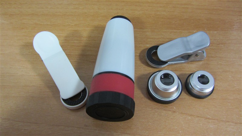 Tenemos 3 objetivos con sus correspondientes pinzas para poder adaptar a la mayoría de terminales, el Tele lleva su propia pinza de color blanco, y el Macro y el Ojo de pez una pinza de menor tamaño de color gris.