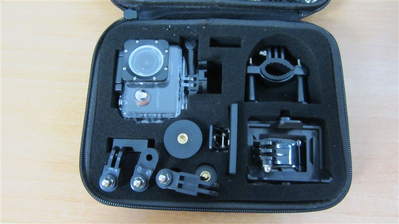 Tras abrir la caja de carton encontramos una maleta con el logo de la de compañía, dentro viene todo perfectamente organizado, tenemos multitud de accesorios para colocar la cámara, 2 baterías, incluso un recambio para tapa trasera de la carcasa sumergible.