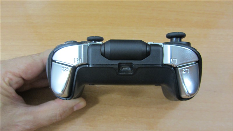 En la parte delantera vemos el conector de carga microUSB, también funcionara conectado con el cable a nuestro pc, podemos apreciar los gatillos, tienen un buen tacto con un aspecto metálico.