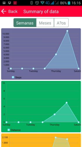En la pantalla principal de la aplicación podremos ver la información diaria, también tenemos acceso a la información del día anterior y un histórico en el que podremos ver la información por semanas, meses o años.