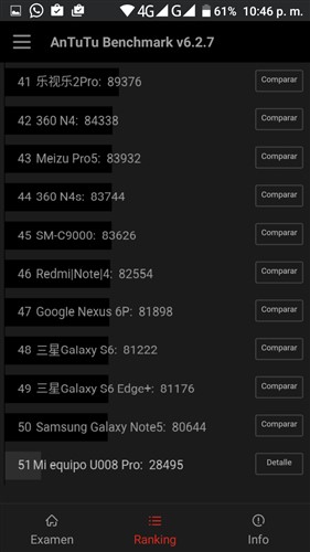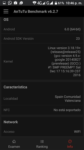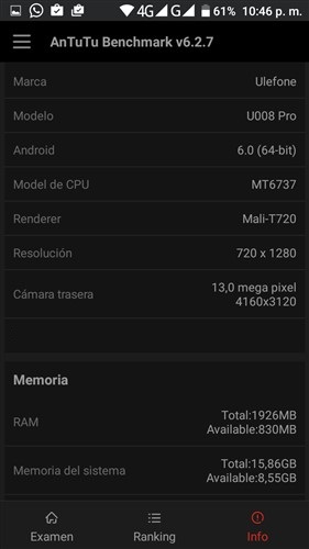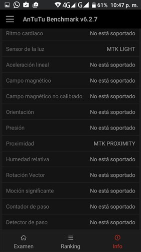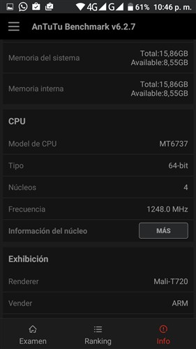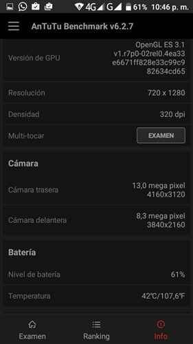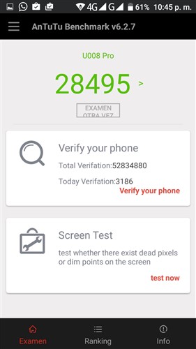 En las pruebas con Antutu consiguió una puntuación de 28495 puntos, entro otros detalles podemos ver la memoria disponible,  los sensores y comprobar el multitouch de la pantalla con tan solo 2 puntos.
