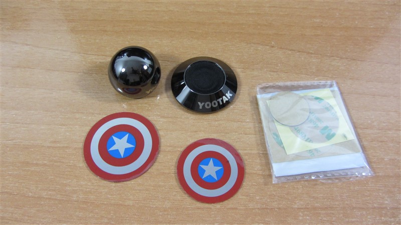 En la caja encontramos todo lo necesario para su colocación, la bola metálica, el disco intermedio fabricado con neodimio, dos discos metálicos de distintos tamaños, recambios de pegatinas 3m y una toallita con alcohol para limpiar las superficies antes de pegar los discos o la bola.