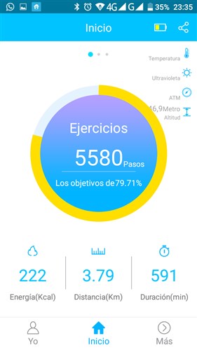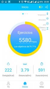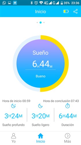 Si pulsamos en el botón Inicio podremos comprobar los datos diarios referente a los pasos, calidad de sueño y el ritmo cardiaco, la información es bastante simple, no podremos ver graficas diarias como en otras pulseras.