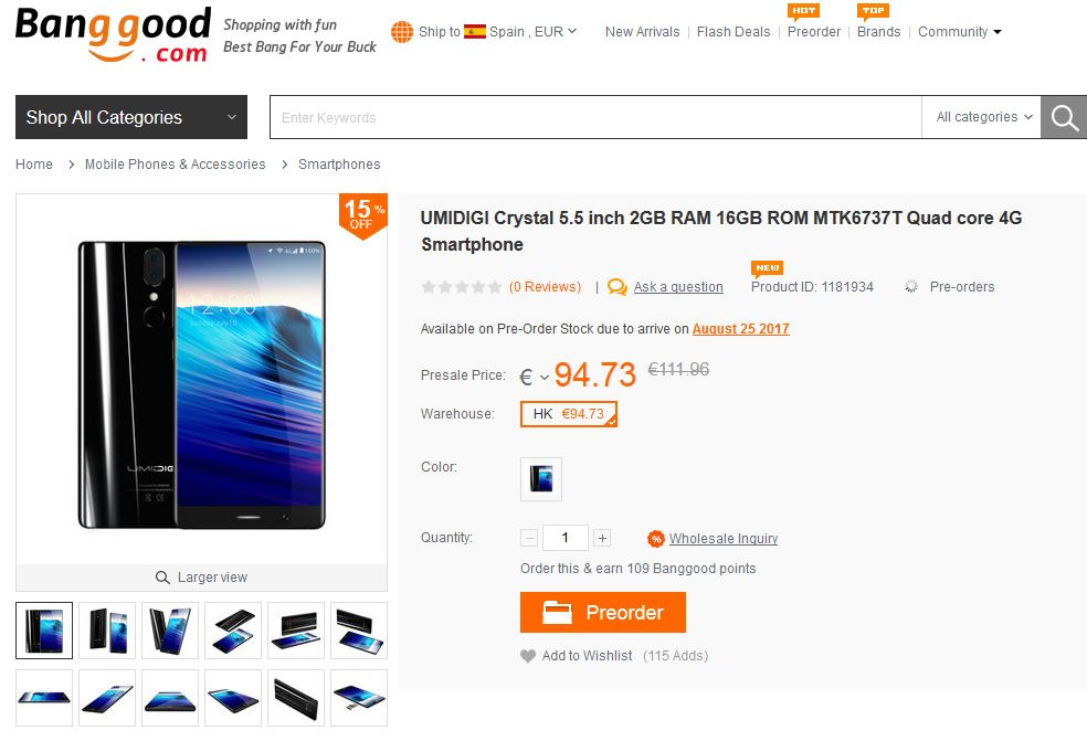 A través de la tienda online Banggood podremos conseguir en breve el nuevo terminal UMIDIGI Crystal de la compañia UMI, un smartphone con pantalla infinita a un precio inmejorable, aunque aun se encuentra en preventa podremos conseguirlo por un precio rebajado hasta el día 14 de agosto por tan solo 94,79€ al cambio (para la versión con 2GB/16GB).