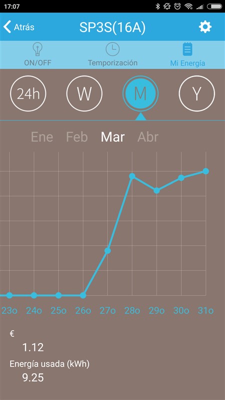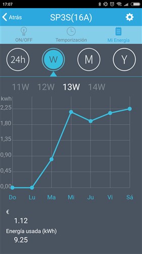 Aquí podéis ver las gráficas de consumo, nos mostrara en 4 pestañas el consumo diario por horas, el semanal, mensual y por años.