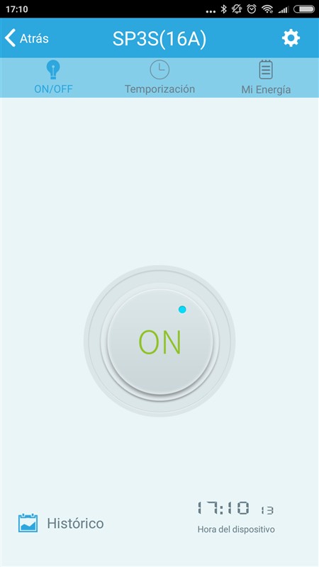 Una vez tengamos conectado el electrodoméstico o dispositivo que queramos monitorizar podremos activarlo tanto desde nuestro móvil como pulsando el botón, cuando este encendido se quedara el botón de color azul fijo.