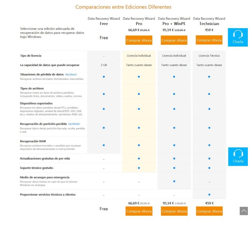 En la siguiente tabla podemos comprobar las funciones de las distintas versiones, la versión gratuita nos limita a 2 gb de recuperación, la versión PRO esta disponible por 66,69€ nos permitirá recuperar cualquier tipo de archivo sin limitaciones y nos garantiza actualizaciones de por vida.
