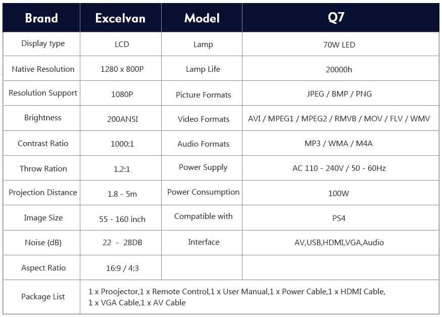 Aqui podemos ver las especificaciones, reproduce la mayoria de ficheros multimedia, podemos apreciar la distancia de proyeccion de entre 1.8 y 5 metros consiguiendo una pantalla de 55 a 160 pulgadas, la lámpara tiene una vida de 20000 horas, pese a que puede parecer poco si dividimos en lo que suele durar una pelicula comprobamos que tenemos diversión para muchos años.