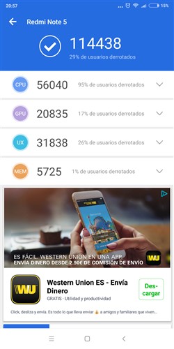 En la pruebas realizadas con Antutu da una puntuacion de 114438 puntos, situandose en el puesto 51.