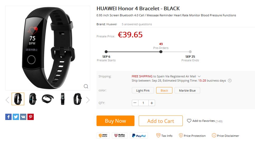 La nueva Honor band 4 podemos encontrarla en preventa en la tienda online de Gearbest por 39,65€, con fecha de envio prevista a partir del próximo día 28 de Septiembre.