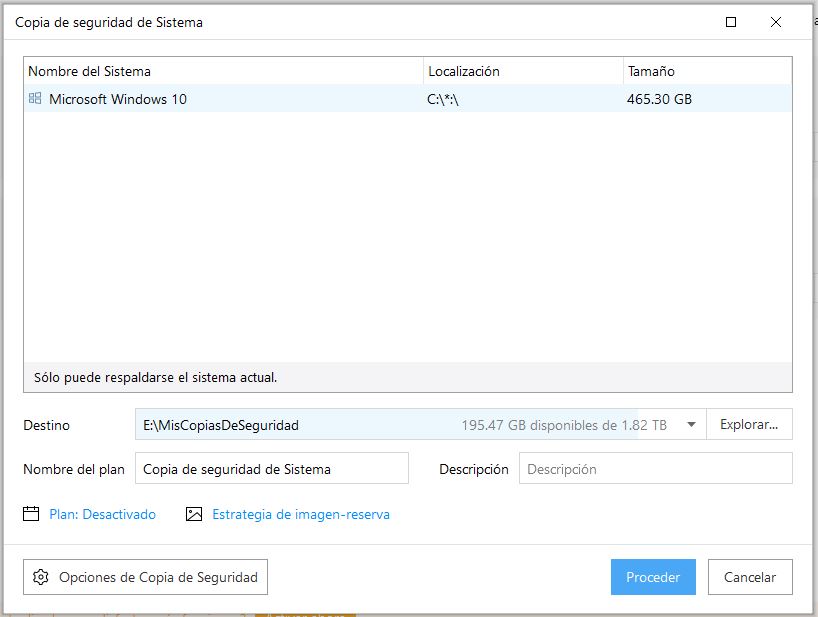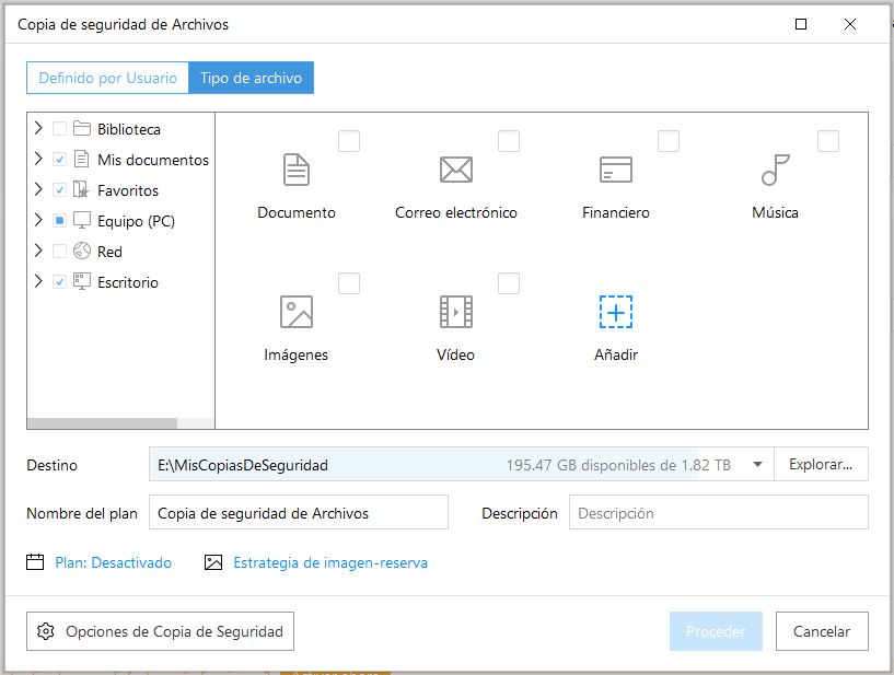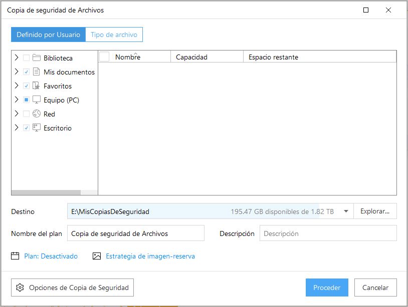 La función de copia de seguridad de archivos o carpetas nos permite elegir por carpetas que es lo que queremos guardar, elegiremos el destino, podremos realizar la copia manual pulsando el botón Proceder o programar un plan de copia pulsando en la esquina inferior izquierda la pestaña Plan.
