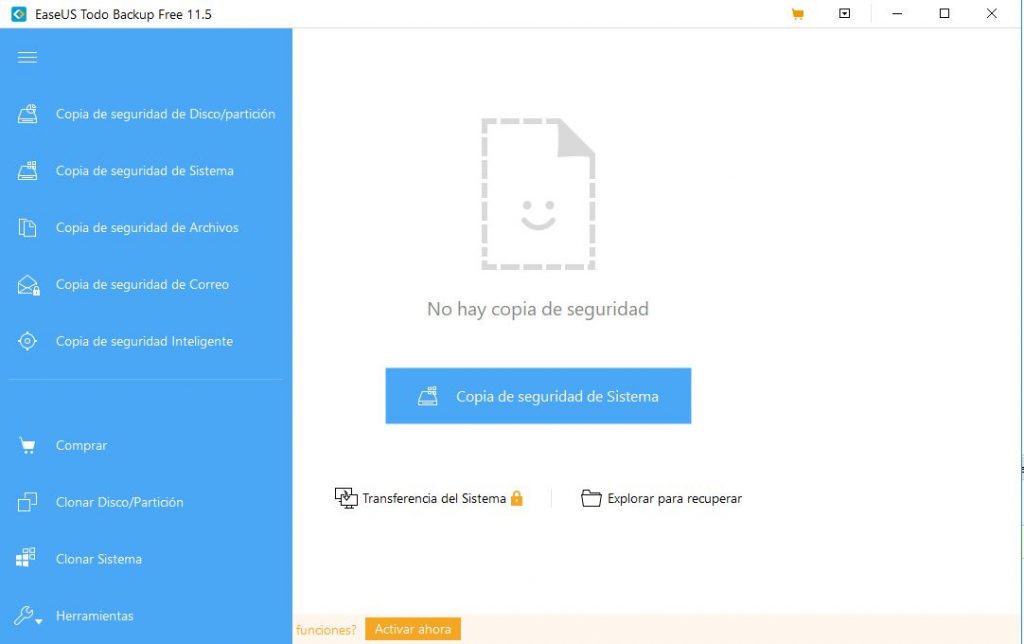 En la barra lateral tenemos todas las opciones, nos permite hace una copia de seguridad de Disco/partición, Copia de seguridad del Sistema, copia de seguridad de Archivos/carpetas, Copia de seguridad de Correo (para la versión Home) y una copia de seguridad inteligente, también nos permite comprar la aplicación clonar un disco duro o partición y clonar el sistema operativo.