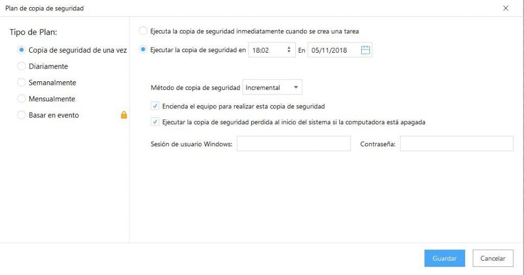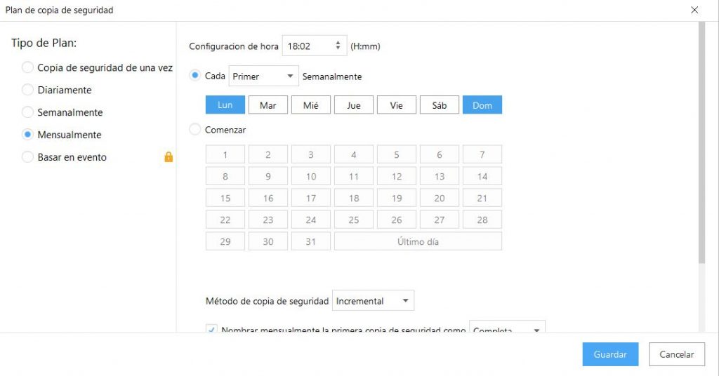Si elegimos el plan mensual podemos elegir la hora, el día y el tipo de copia (Completa o Incremental).
