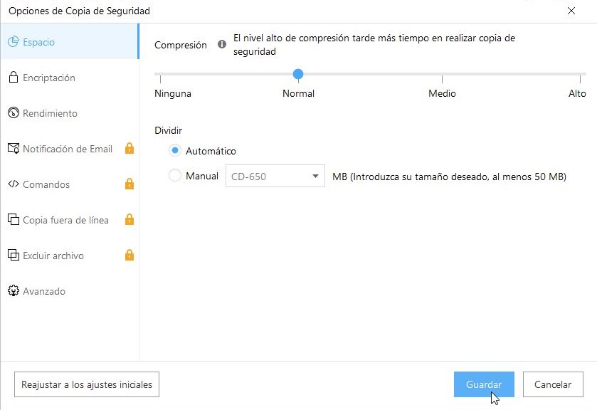En opciones de seguridad podremos elegir el nivel de compresión y encriptar la copia con contraseña, el resto de opciones son accesibles para la versión de pago.