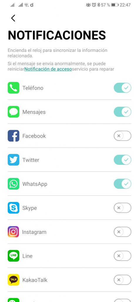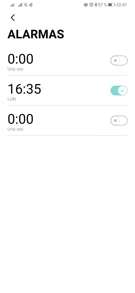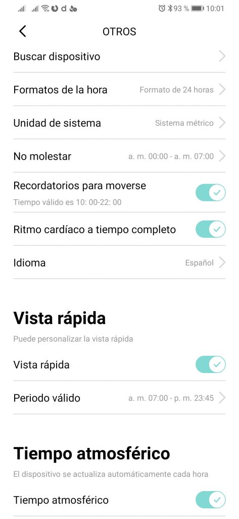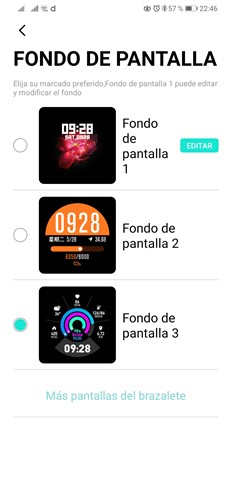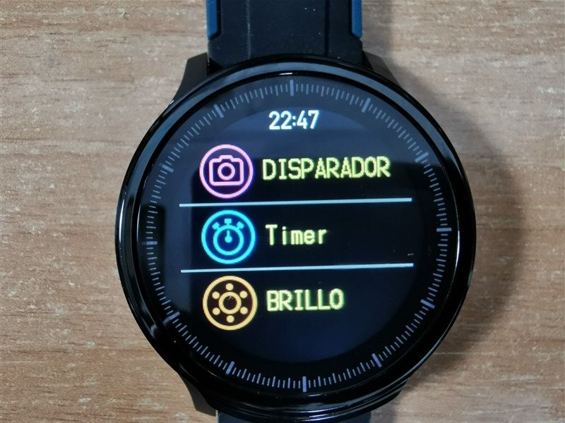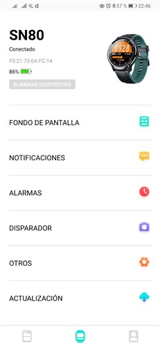 En la segunda pestaña tenemos las opciones de configuración, podremos cambiar el fondo de pantalla, configurar las notificaciones, Alarmas, activar el disparador remoto, y en la función otros nos permite configurar opciones como no molestar, recordatorio sedentario, etc.