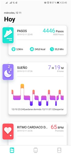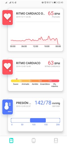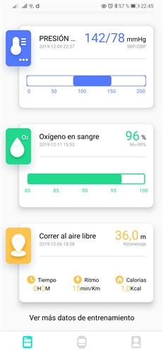 Desde la aplicación podemos comprobar los pasos diarios, el sueño, el ritmo cardíaco las 24 horas, y realizar mediciones puntuales de presión arterial, ritmo cardíaco y el oxigeno, y la función de correr al aire libre en la cual actúa el gps del smartphone para monitorizar el recorrido, el resto de mediciones de otros deportes nos aparecerá debajo de la función de correr.