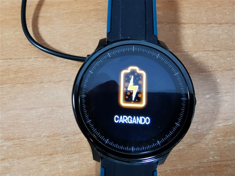 En la caja encontramos el reloj, un cable para cargarlo y un manual de instrucciones en diversos idiomas, entre ellos en Español.