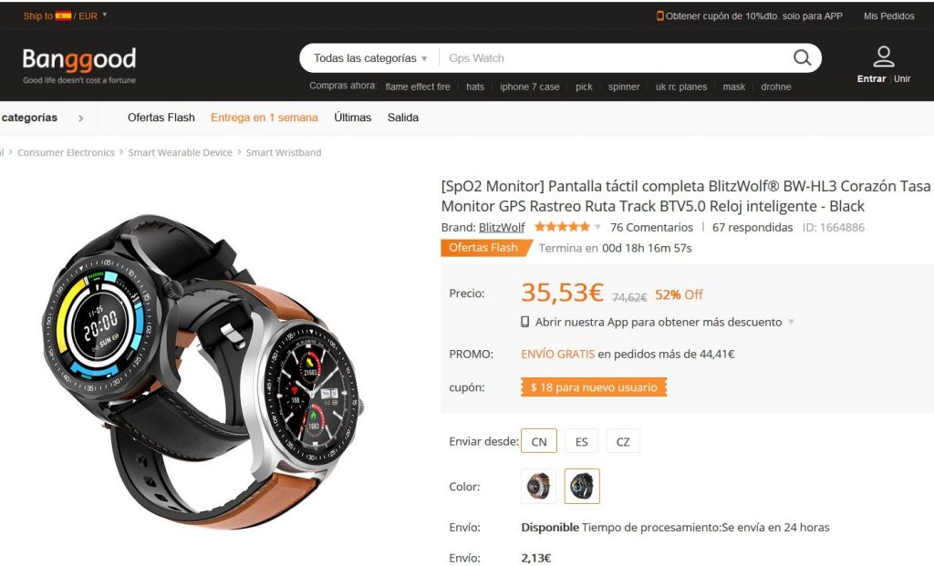 El BW-HL3 es un reloj inteligente que podemos conseguir en Banggood desde 35€ con envío desde China o por un poco mas, por 44€ ,con envío rápido en 2 o 3 días, desde España.