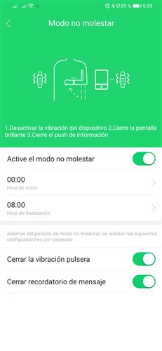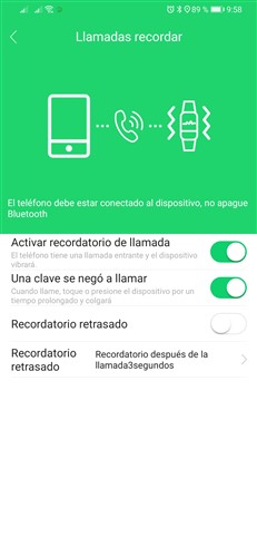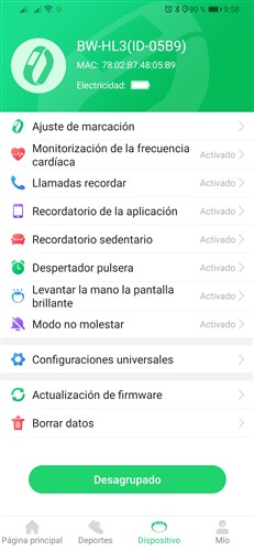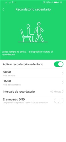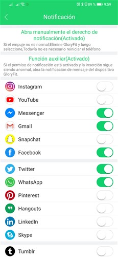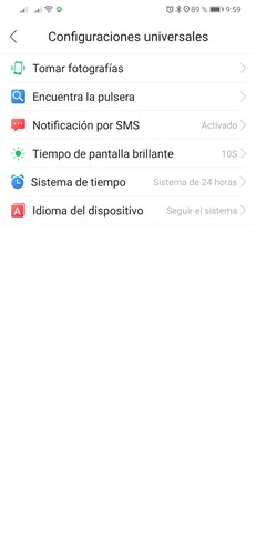 Desde la aplicación Glory Fit podremos activar o desactivar ciertas funciones, recordatorios de llamadas, ritmo cardiaco, alarmas, uso sedentario, etc.